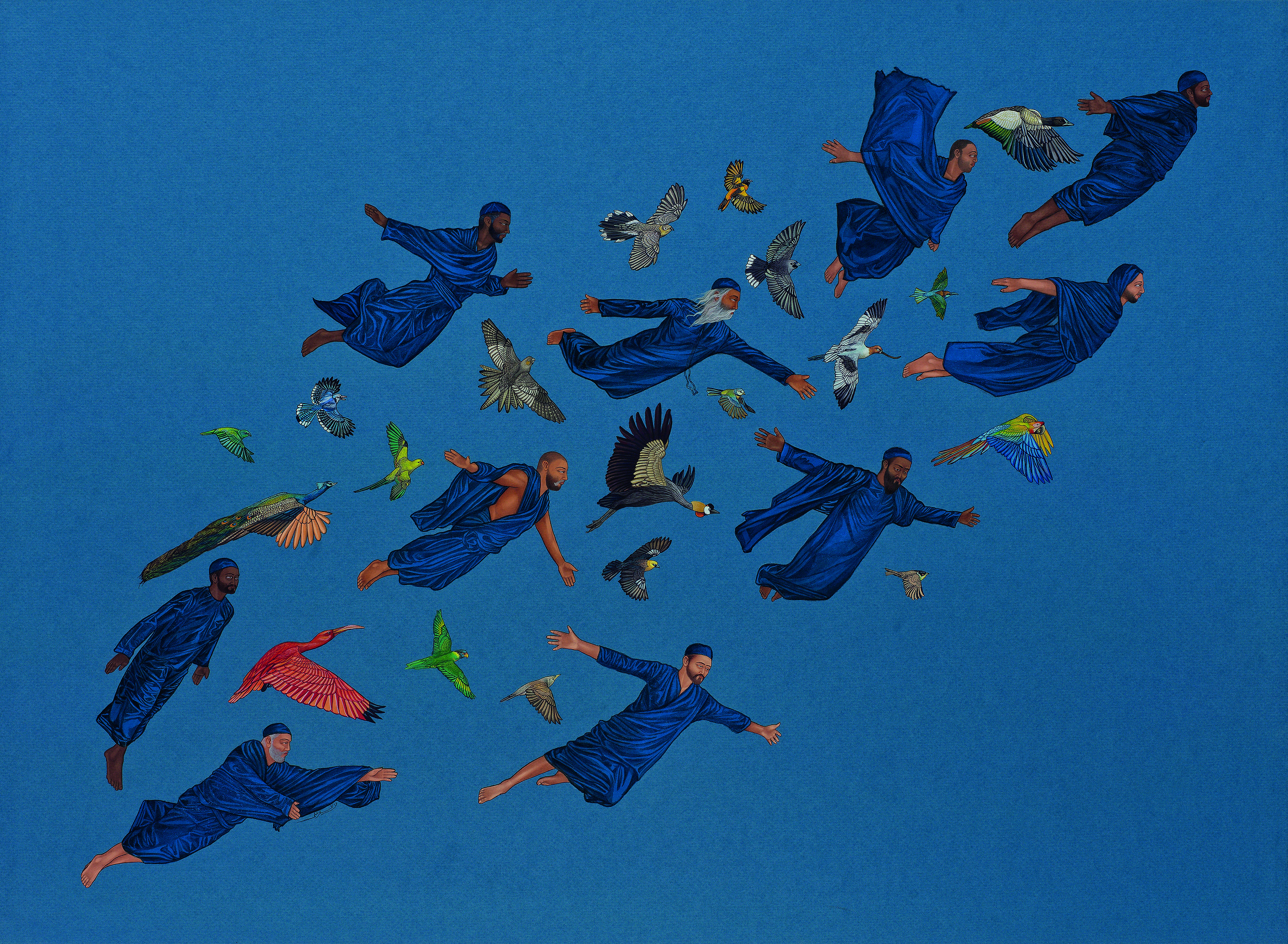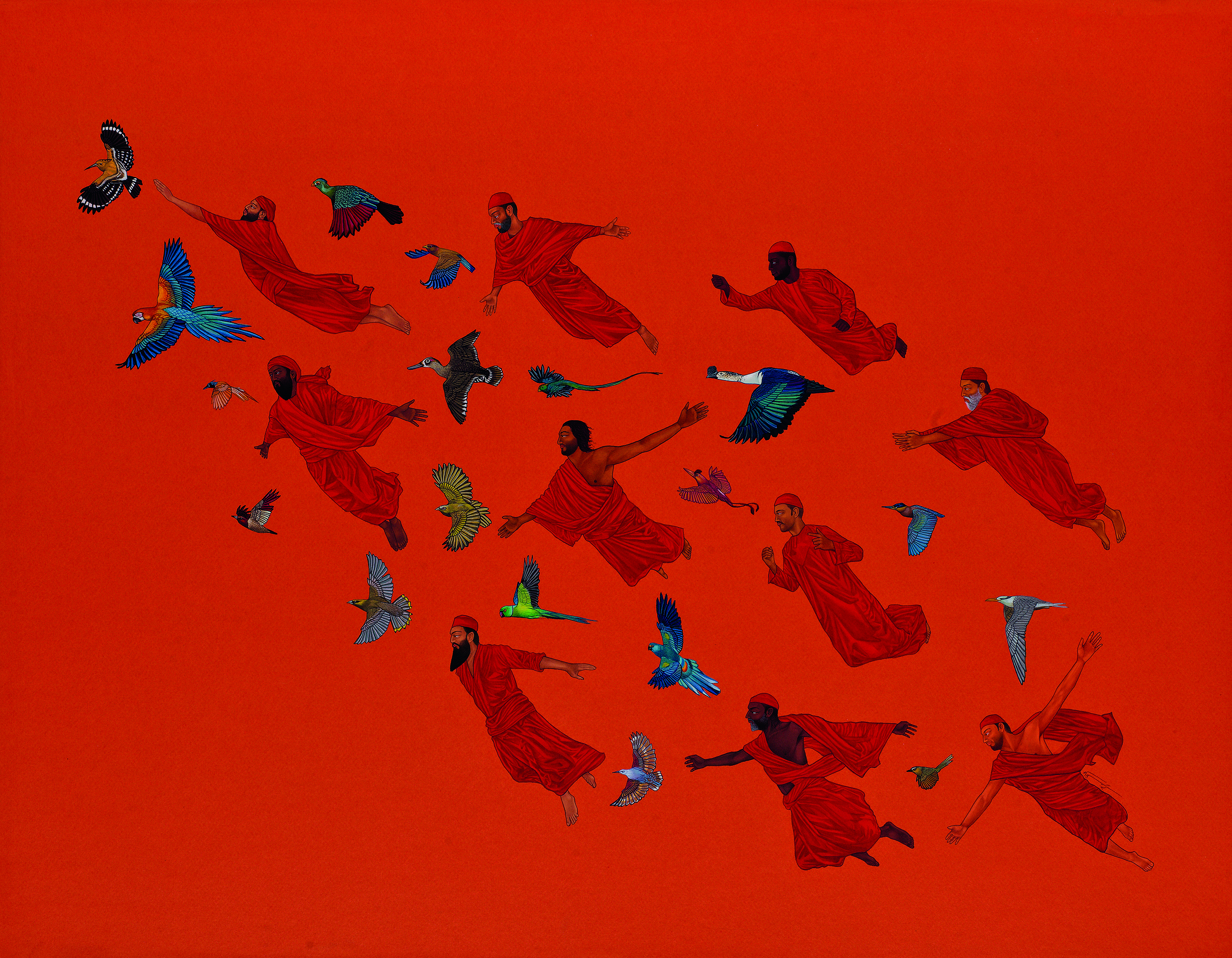 The colour palette employed across his paintings is bold and saturated. The contrast between vibrant backgrounds and more naturalistic rendering of bodies and birds heightens the sense of transcendence, suggesting inner states rather than physical location.