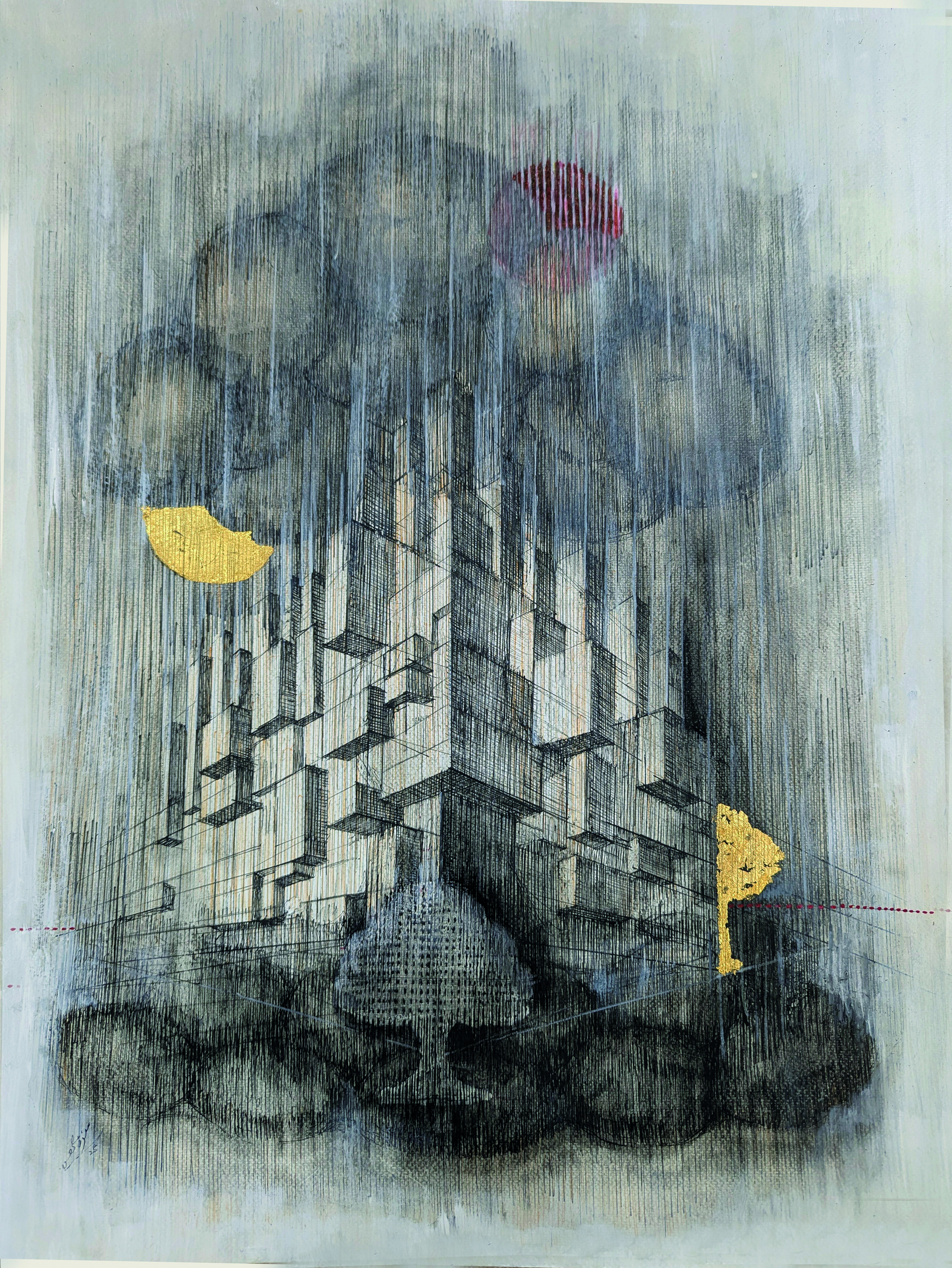 Karachi’s dense and expanding urban landscape, where rapid development has increasingly displaced natural environment has left Munawar feeling lost and helpless. “I find myself suspended between the concrete grip and the whisper of a vanishing horizon. The city pulse fuels my art, yet every beat echoes with what we’ve surrendered – natures silence, the trees shade, the clouds whisper.”
