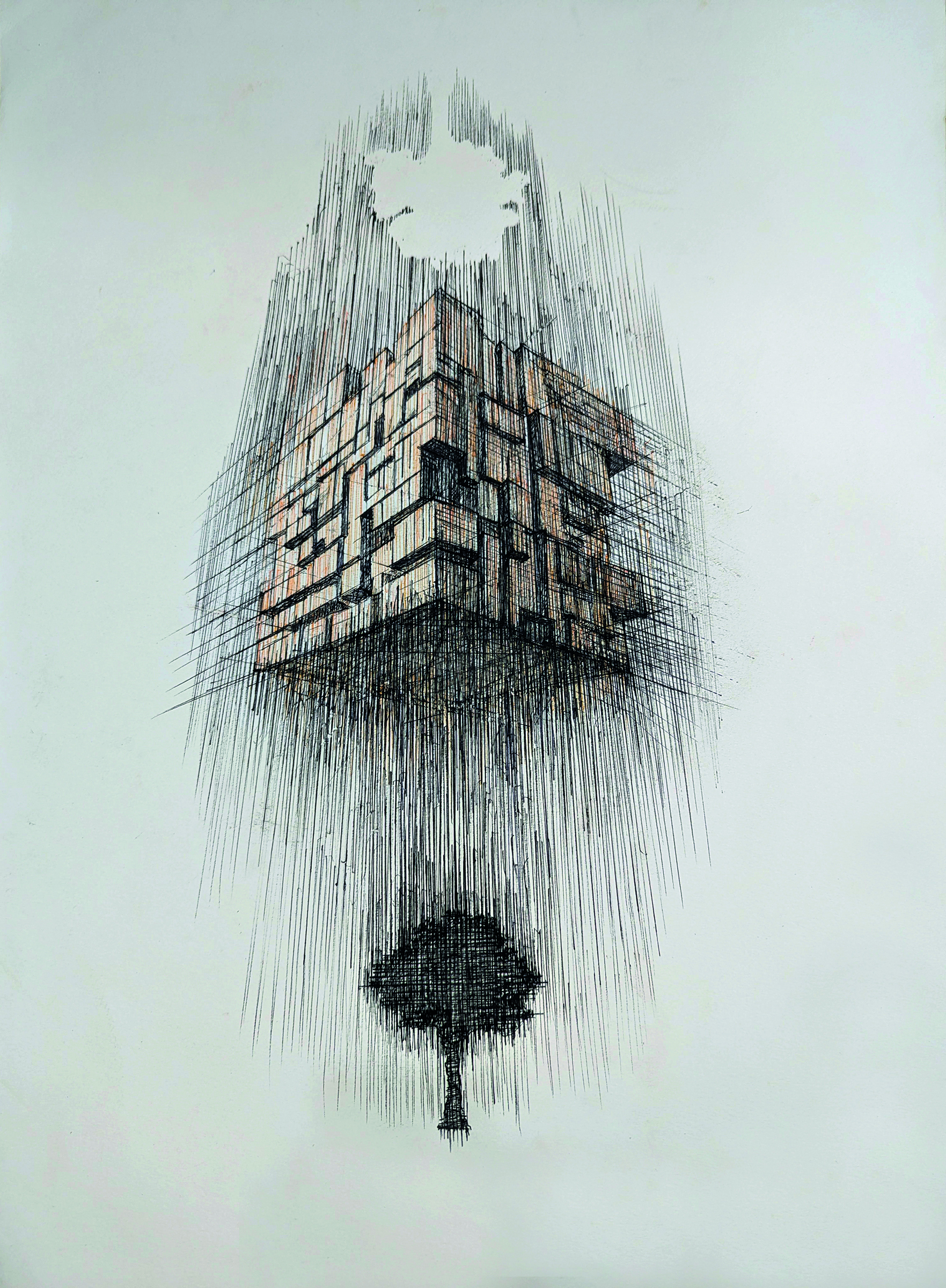 One of the pieces, titled, Solastalgia, done in pen and ink on archival paper depicts a tense interplay between architectural rigidity and organic fragmentation. The dense, hovering structure suggests urban pressure and containment, while the fractured forms below suggest erosion, memory, loss. The small bird forms at the bottom suggest vulnerability and transience – life persisting under the weight of urban expansion.