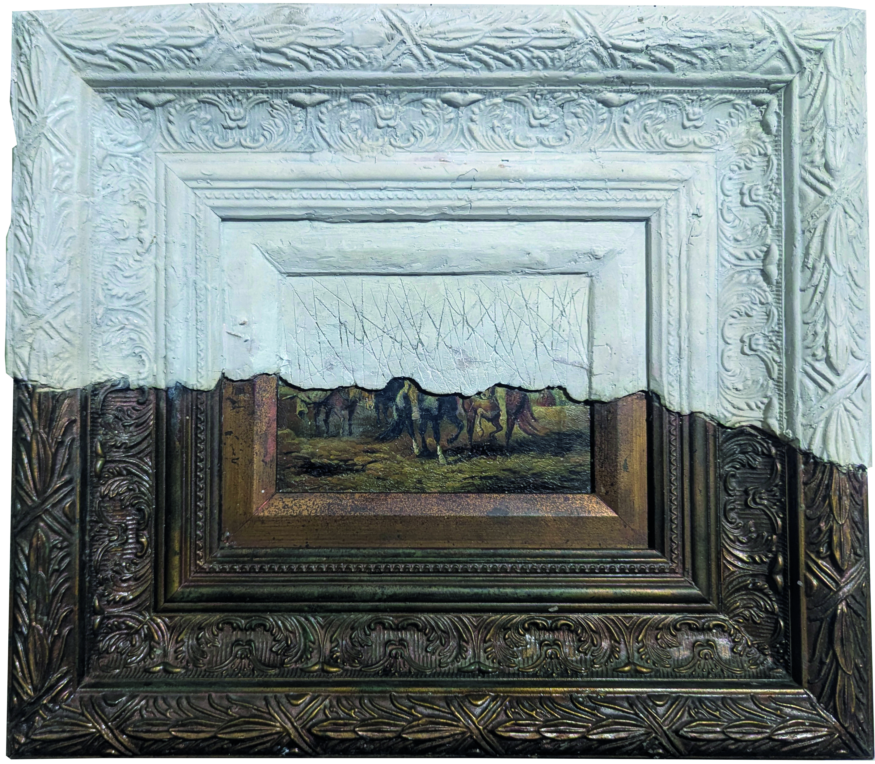 Another untitled piece, done in wood, white cement and plaster on acrylic on board acts as a dominant sculptural presence. Its excessive ornamentation and weight visually overwhelm the image it contains. The landscape within it seems fragile and distant, as if receding into the background. Much like the comparisons Munawar draws in his work about how urbanisation has impacted environmental change, causing so much to erode and be destroyed to make way for urban development.