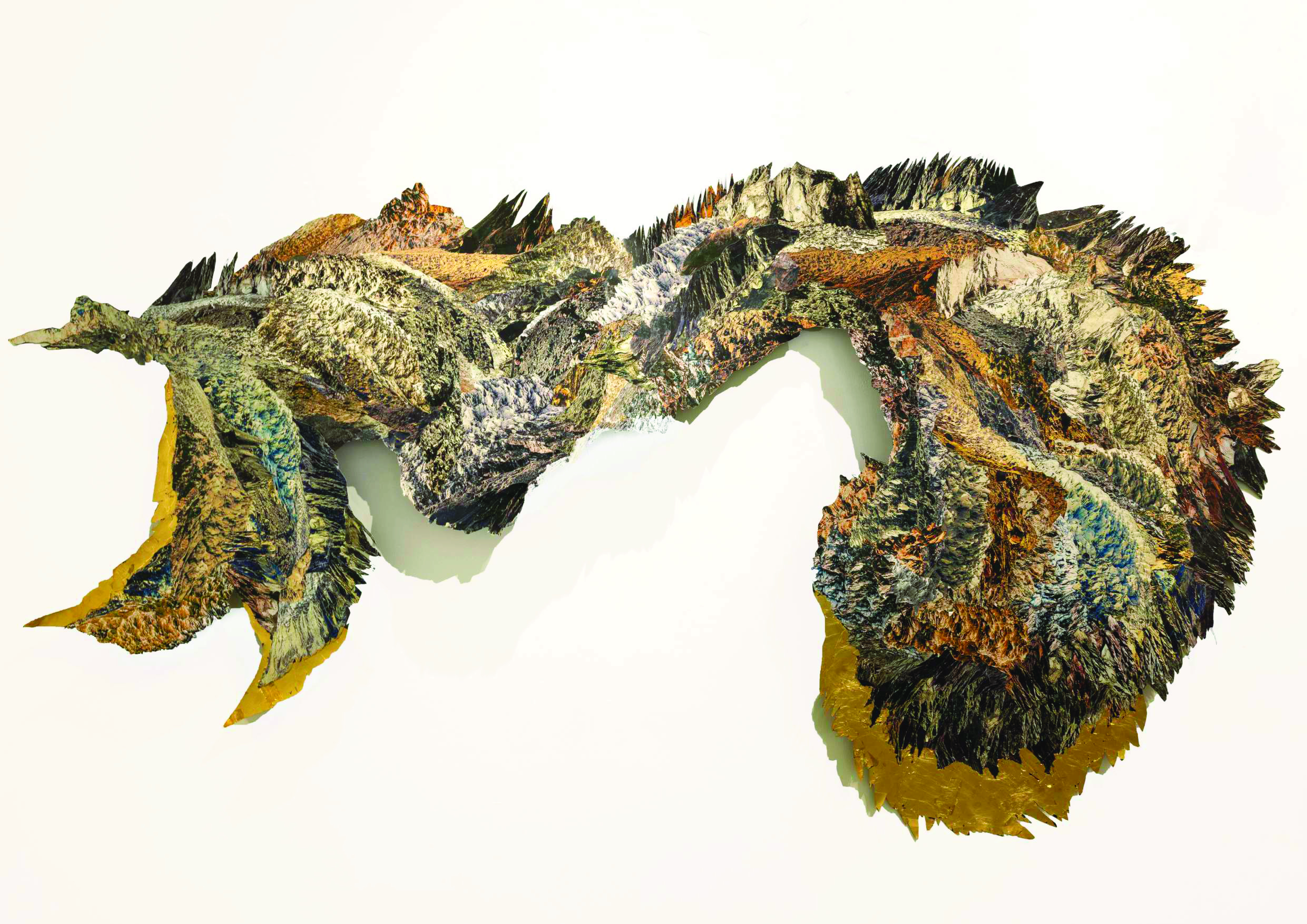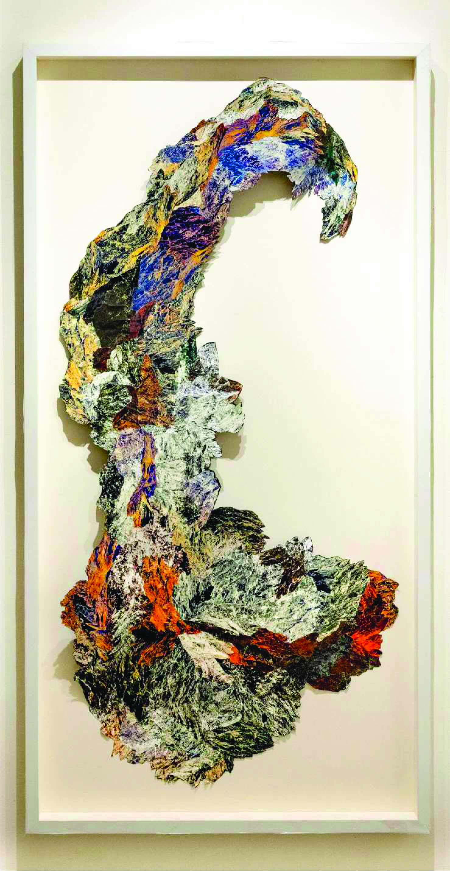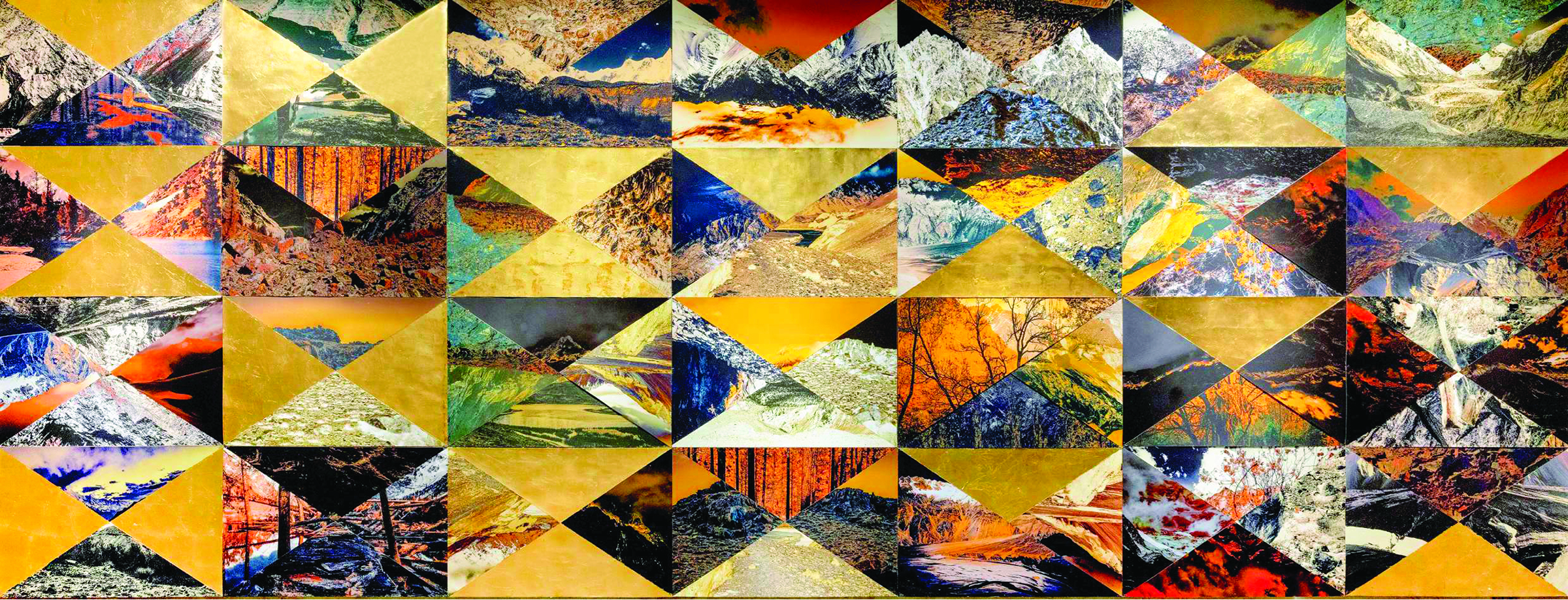 Naazish Ata-Ullah comments on the artist’s influence and journey, “In Sarah Ahmad’s work, vast landscapes are not simply recorded but transformed. Ahmad takes fragments of these environments, selecting, cutting, editing, moving them through stages of transmutation. The spine of this work is her own experience: taking fragments and piecing them together, pieces of trauma and displacement of a life not rooted in any one place. The cutting and piecing together of fragments mirrors this, a fragmented existence transformed into new structures. This is not detachment, but a journey. Rebuilding from wreckage. Ahmad’s research happens through direct experience of the landscape, walking, hiking, and being in nature. She witnesses both renewal and destruction, the healing power of the land alongside scars of extraction and displacement. The landscapes of Gilgit, of Oklahoma and New Mexico in the rural parts of the US, have been inspirational and even nurturing. This is a quietness to these places, something that finds expression in the fragments themselves. One senses the spiritual energy connecting us.”