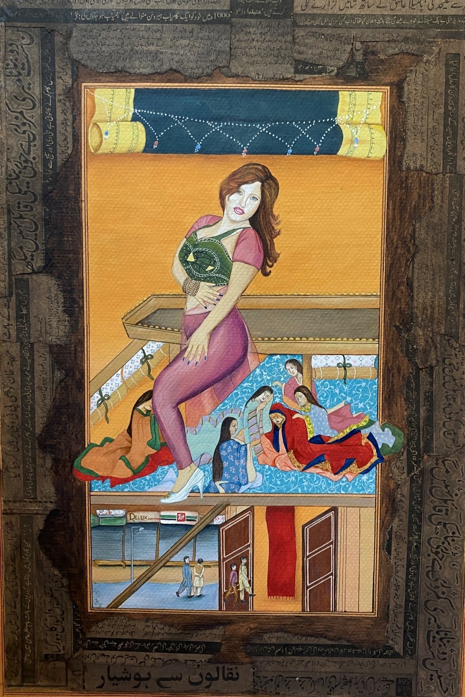 For example, Tazeen Qayyum’s (b. 1973) “Wedding of a prostitute” completed during her residency in Vienna, Austria supported by UNESCO International Fund for the promotion of culture and exhibited at Gallery Juttner in 2000 was on the cover of the highly controversial invitation card sent out by the High Commission of Pakistan. A statement written by Tazeen Qayyum on the inside of the card read “The challenge for a contemporary artist like myself, who choose a traditional art form, is to make it convincing and relevant to our times”. The painting brilliantly portrayed a wish turning to reality for a sex worker in Lahore with the border formed from newspaper cutouts that caution against imposters.