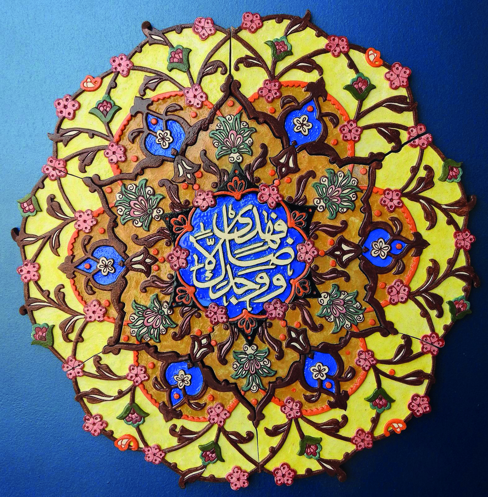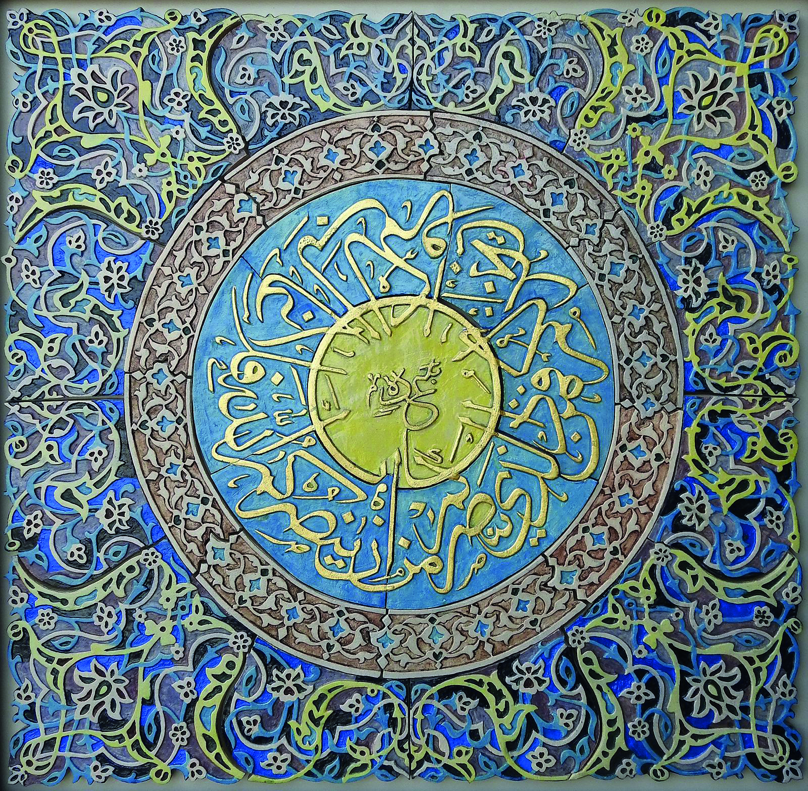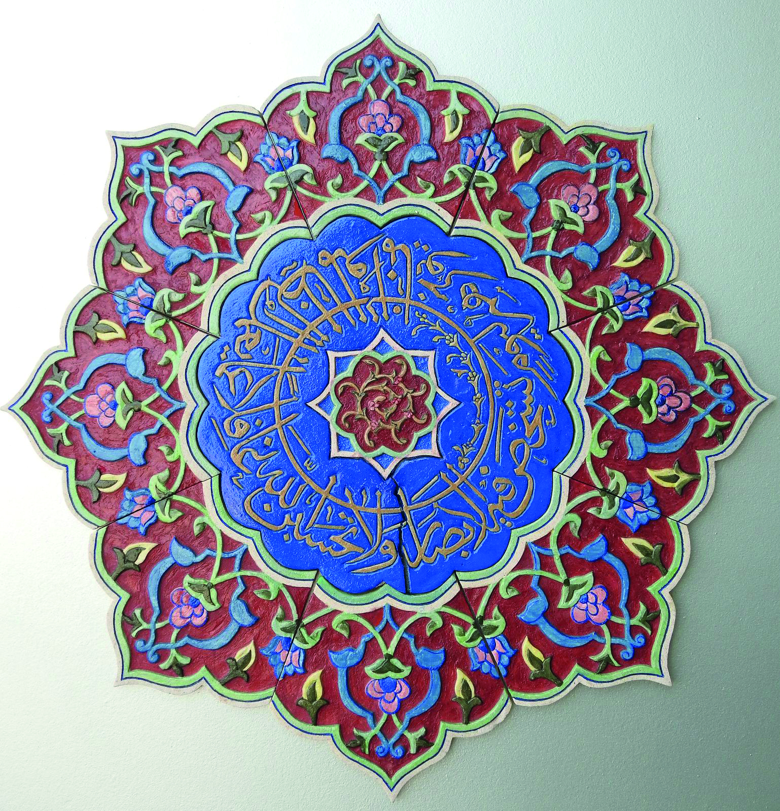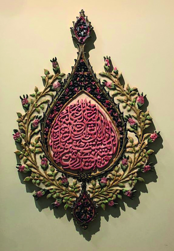 Horeen shares, “I set out to create intricate murals inspired by Iznik patterns, integrating them with Quranic calligraphy to reflect both aesthetic harmony and spiritual depth. This project became a journey of patience, devotion and craftsmanship. I began by sketching Iznik motifs, carefully merging them with selected Quranic verses to form unified compositions. These drawings were then transferred onto clay slabs prepared according to the design dimensions. Using a range of tools, I meticulously carved out the negative spaces, shaping every detail by hand. Once the carving was completed each mural was cut not in a rigid grid, but along subtle, organic angles that preserved the integrity of the design. The process was both meditative and demanding. Over 2.5 years, I hand carved 32 murals, refining each piece to achieve a clean and balanced finish. Colour application introduced another layer of complexity. I used imported oxide stains, finely grounded to achieve a smooth pigment. Preparing and applying these colours with rigorous, but essential to bringing depth and vibrancy to the world. Ceramics, however, are not complete without glazing, a step that ensures permanence and luminosity. For this I travelled from Lahore to Multan to glaze and fire the murals at a ceramic facility. Each fragile piece was packed with utmost care, layered in thermocole, foam sheets and secured with wooden boards to ensure safe transport. When framing was done, I applied 24 carat gold leaf paper onto murals to give it a luminous look which describes my subject, ‘Iznik Illumination’.”