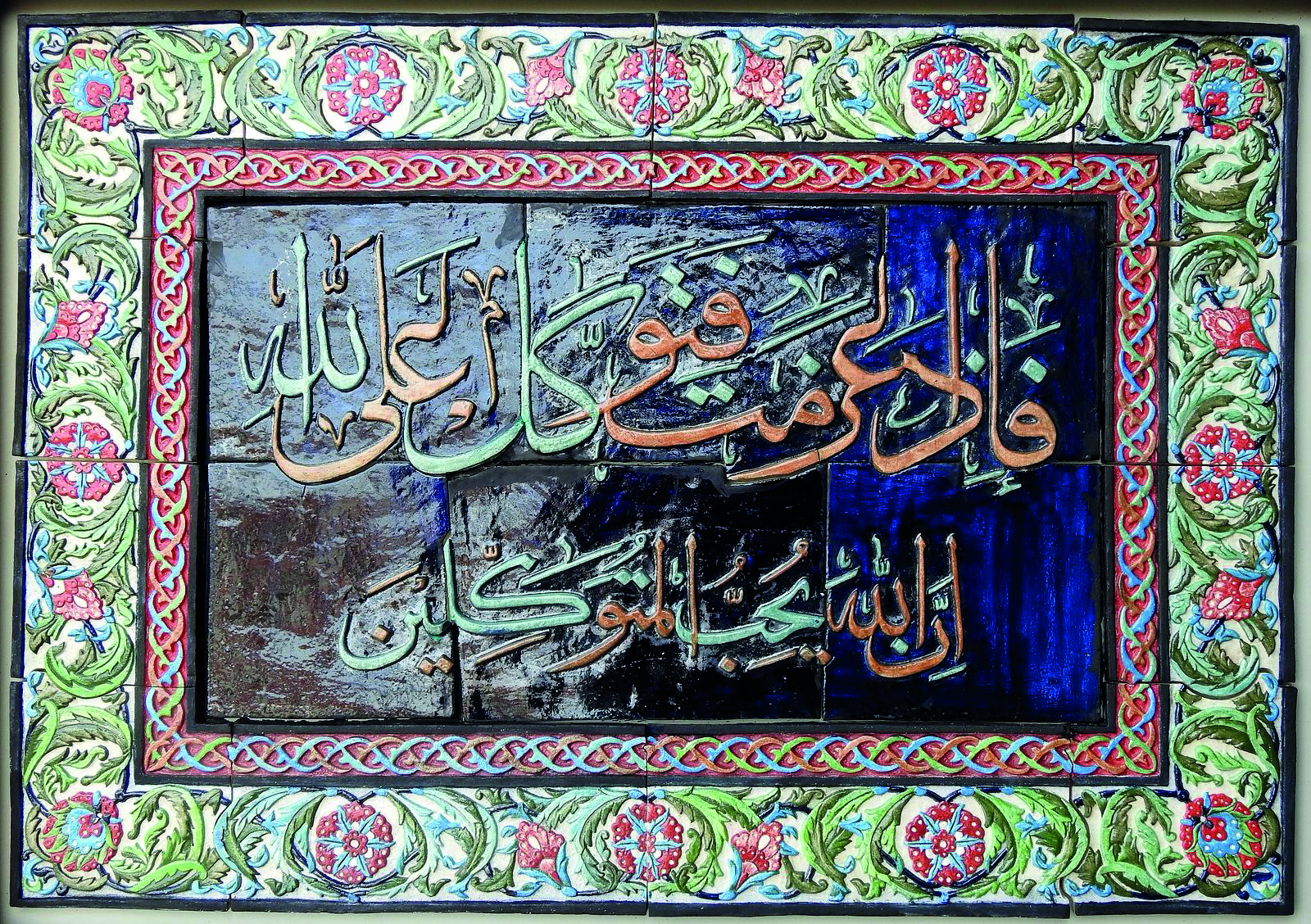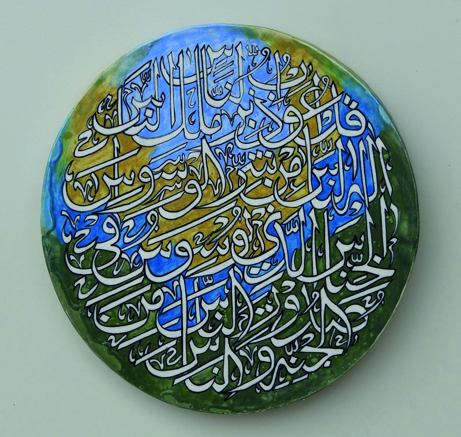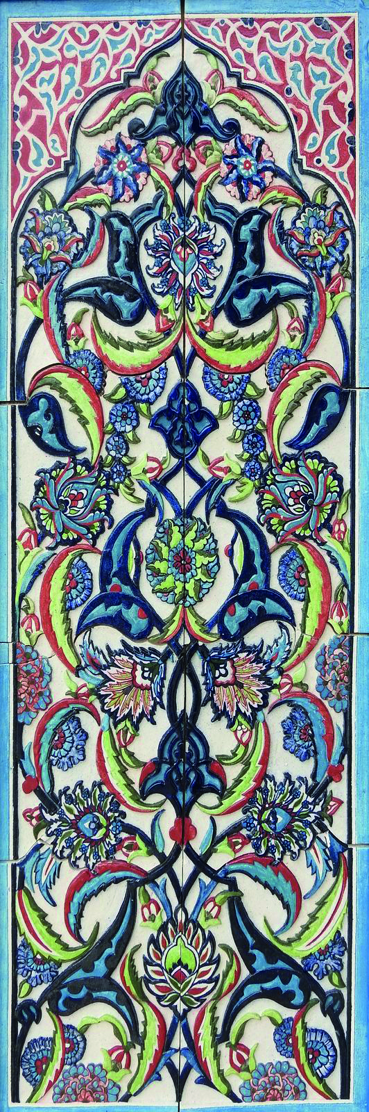 Horeen shares, “I set out to create intricate murals inspired by Iznik patterns, integrating them with Quranic calligraphy to reflect both aesthetic harmony and spiritual depth. This project became a journey of patience, devotion and craftsmanship. I began by sketching Iznik motifs, carefully merging them with selected Quranic verses to form unified compositions. These drawings were then transferred onto clay slabs prepared according to the design dimensions. Using a range of tools, I meticulously carved out the negative spaces, shaping every detail by hand. Once the carving was completed each mural was cut not in a rigid grid, but along subtle, organic angles that preserved the integrity of the design. The process was both meditative and demanding. Over 2.5 years, I hand carved 32 murals, refining each piece to achieve a clean and balanced finish. Colour application introduced another layer of complexity. I used imported oxide stains, finely grounded to achieve a smooth pigment. Preparing and applying these colours with rigorous, but essential to bringing depth and vibrancy to the world. Ceramics, however, are not complete without glazing, a step that ensures permanence and luminosity. For this I travelled from Lahore to Multan to glaze and fire the murals at a ceramic facility. Each fragile piece was packed with utmost care, layered in thermocole, foam sheets and secured with wooden boards to ensure safe transport. When framing was done, I applied 24 carat gold leaf paper onto murals to give it a luminous look which describes my subject, ‘Iznik Illumination’.”