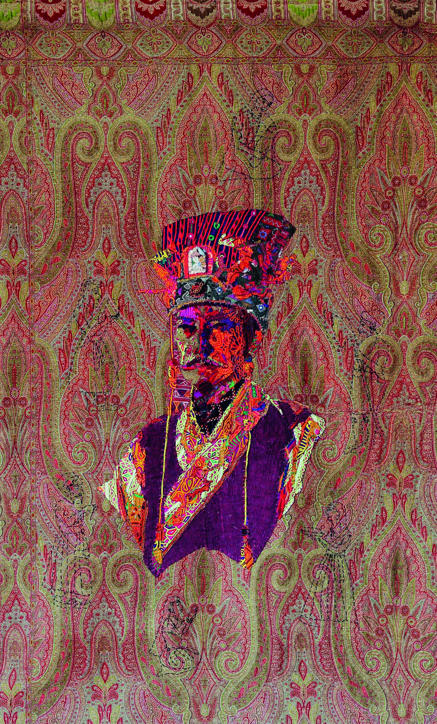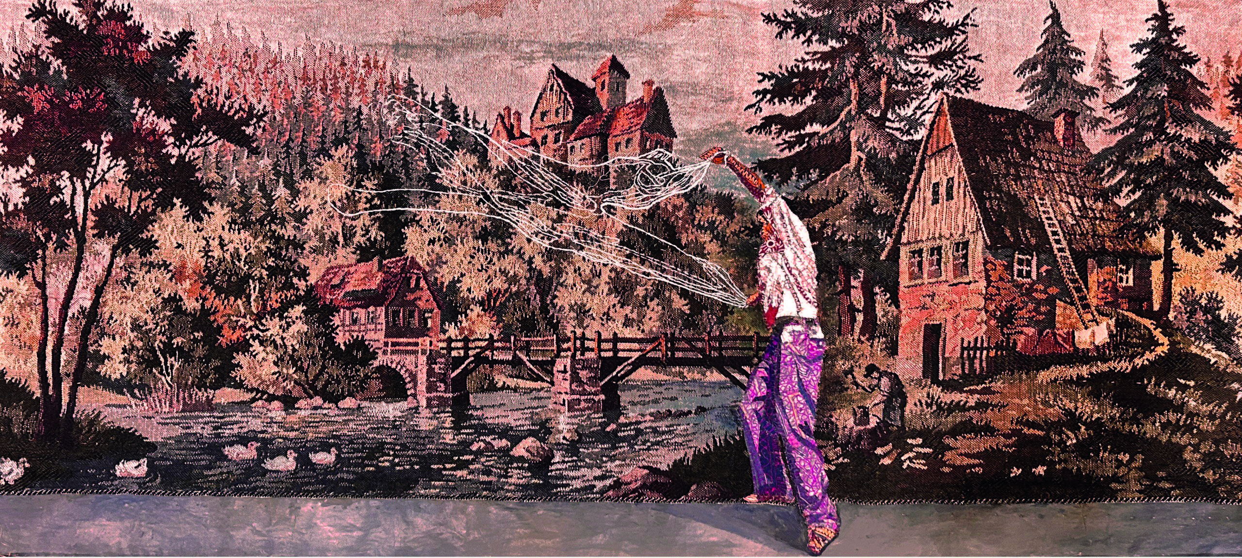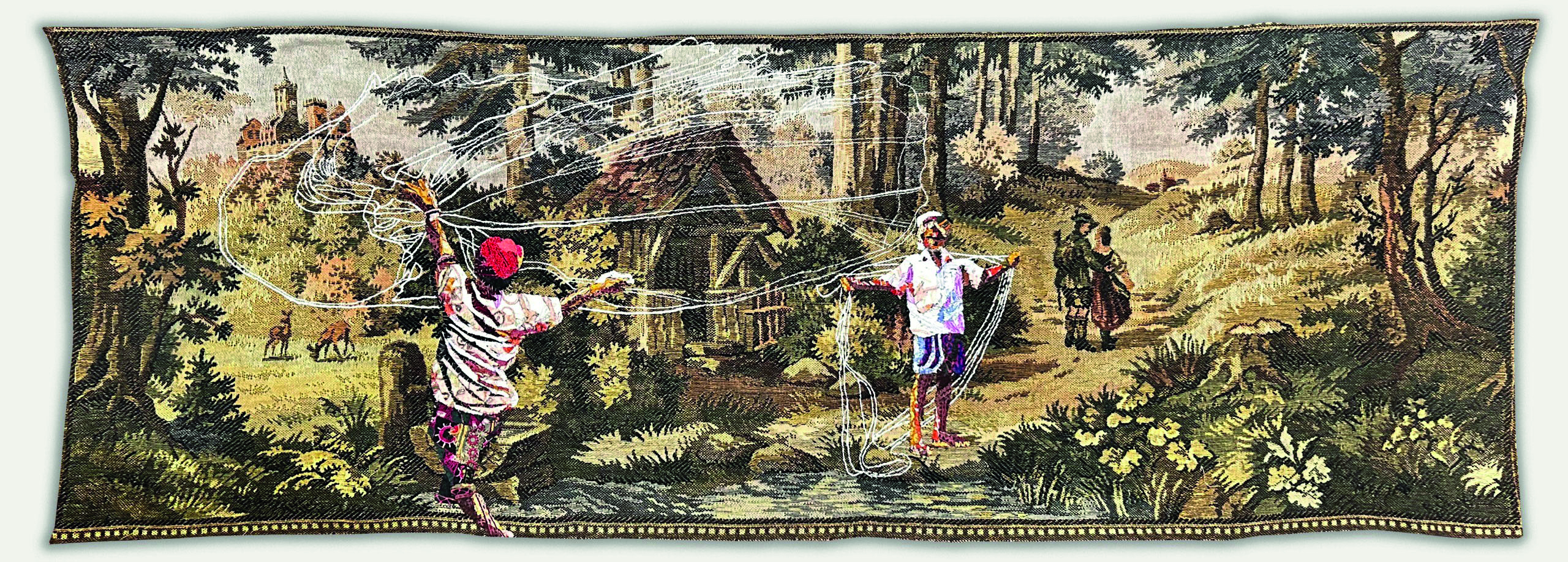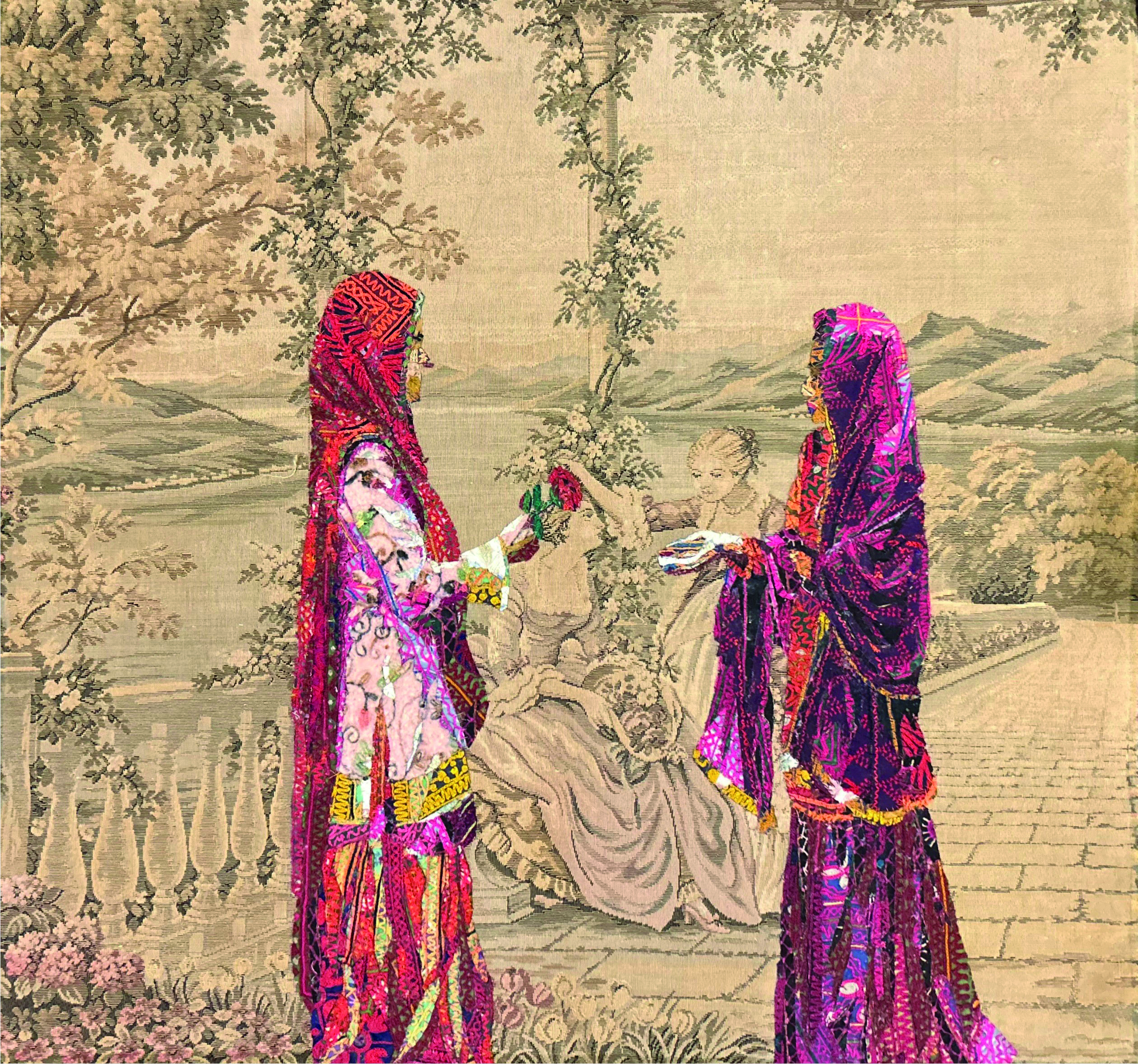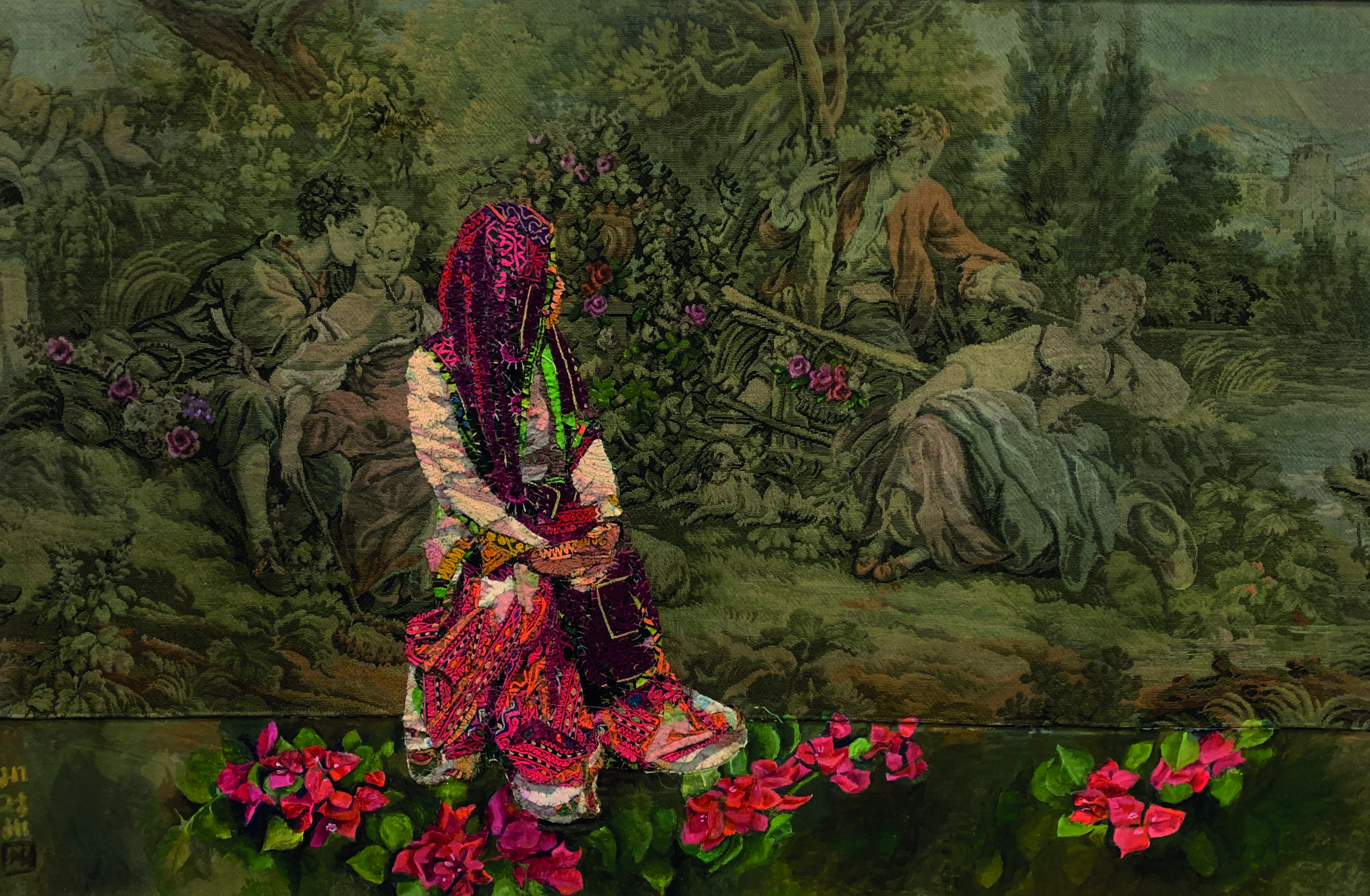 Gardens Of The Past, Textile collage on tapestry and oil, 23 x 35 inches, 2025