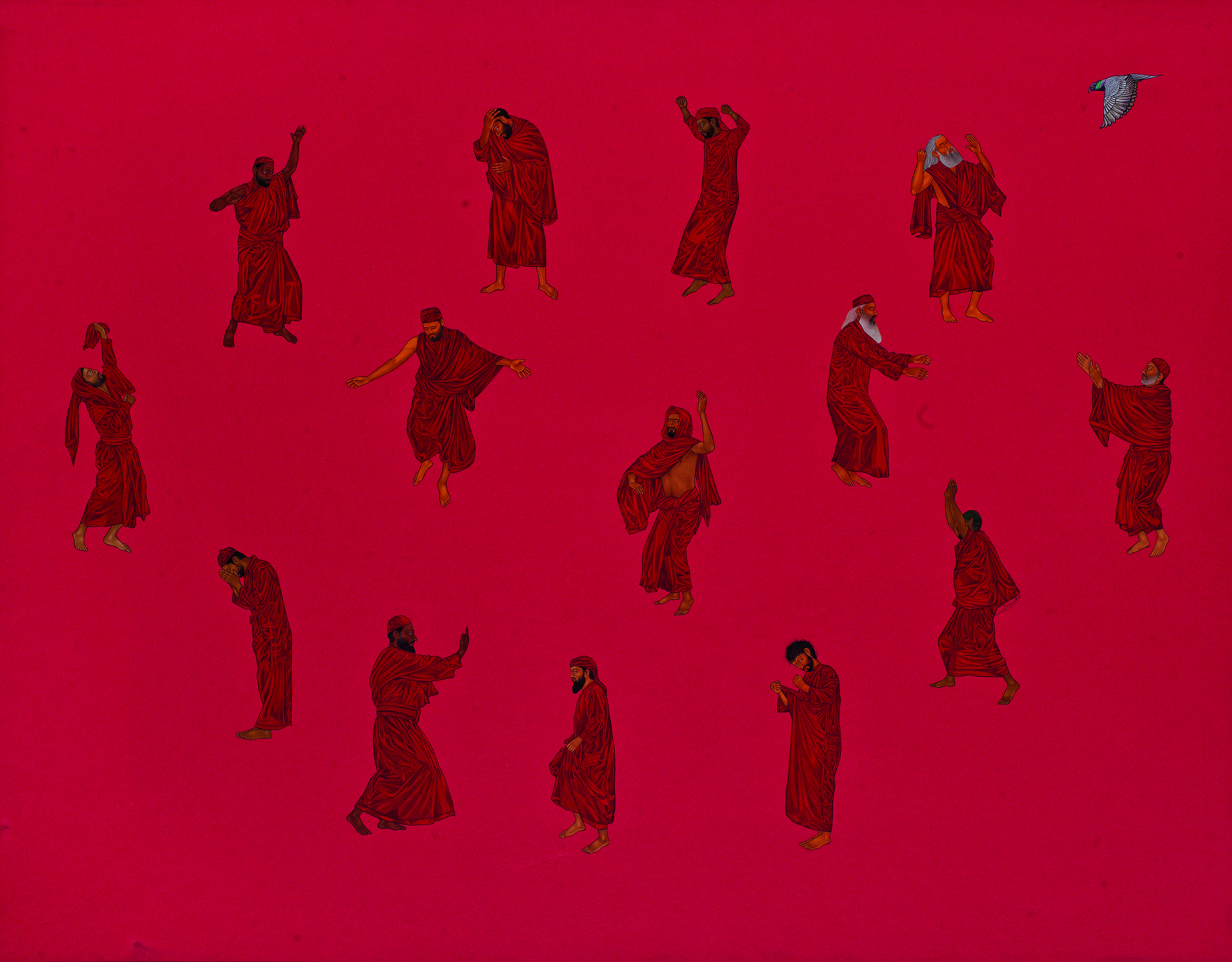 In Zafar’s work one figures and birds are isolated against expansive, unmodulated backgrounds, creating a sense of suspension and timelessness. The compositions rely on rhythm and patterns, allowing movement, ritual and contemplation to unfold across the surface.