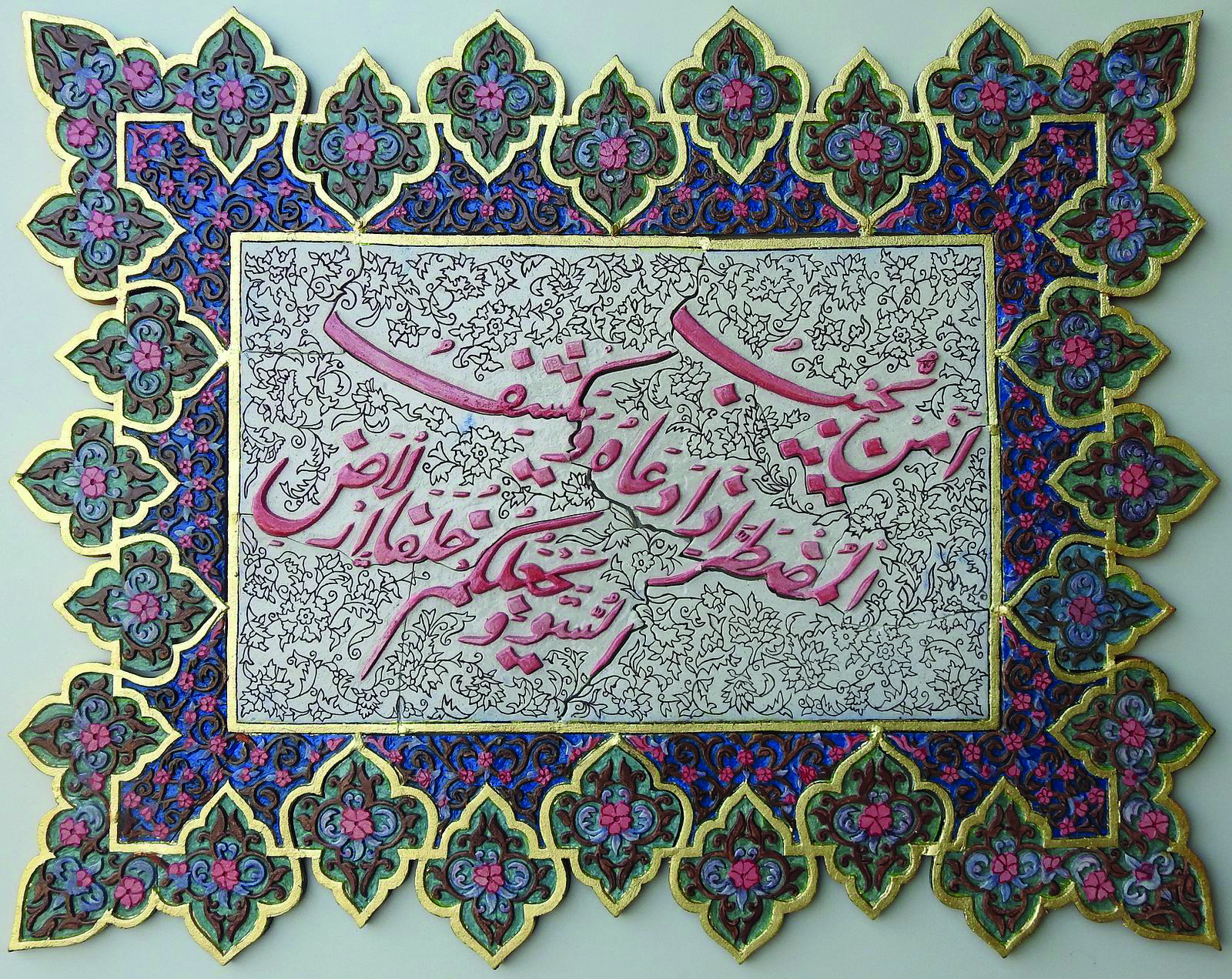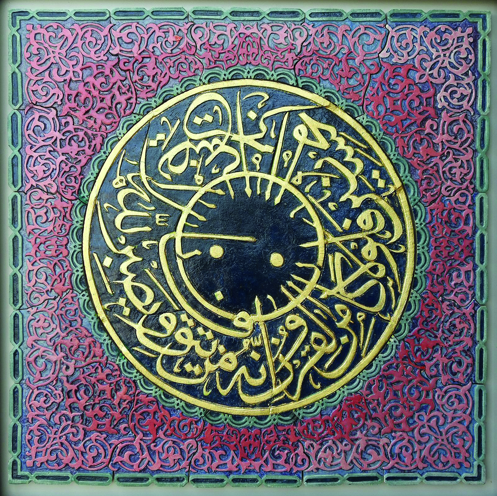 Horeen shares, “I set out to create intricate murals inspired by Iznik patterns, integrating them with Quranic calligraphy to reflect both aesthetic harmony and spiritual depth. This project became a journey of patience, devotion and craftsmanship. I began by sketching Iznik motifs, carefully merging them with selected Quranic verses to form unified compositions. These drawings were then transferred onto clay slabs prepared according to the design dimensions. Using a range of tools, I meticulously carved out the negative spaces, shaping every detail by hand. Once the carving was completed each mural was cut not in a rigid grid, but along subtle, organic angles that preserved the integrity of the design. The process was both meditative and demanding. Over 2.5 years, I hand carved 32 murals, refining each piece to achieve a clean and balanced finish. Colour application introduced another layer of complexity. I used imported oxide stains, finely grounded to achieve a smooth pigment. Preparing and applying these colours with rigorous, but essential to bringing depth and vibrancy to the world. Ceramics, however, are not complete without glazing, a step that ensures permanence and luminosity. For this I travelled from Lahore to Multan to glaze and fire the murals at a ceramic facility. Each fragile piece was packed with utmost care, layered in thermocole, foam sheets and secured with wooden boards to ensure safe transport. When framing was done, I applied 24 carat gold leaf paper onto murals to give it a luminous look which describes my subject, ‘Iznik Illumination’.”
